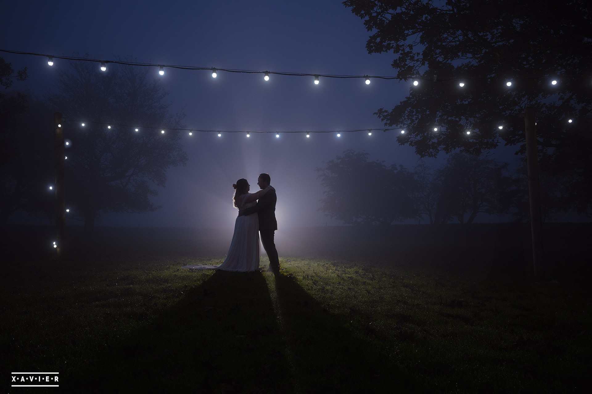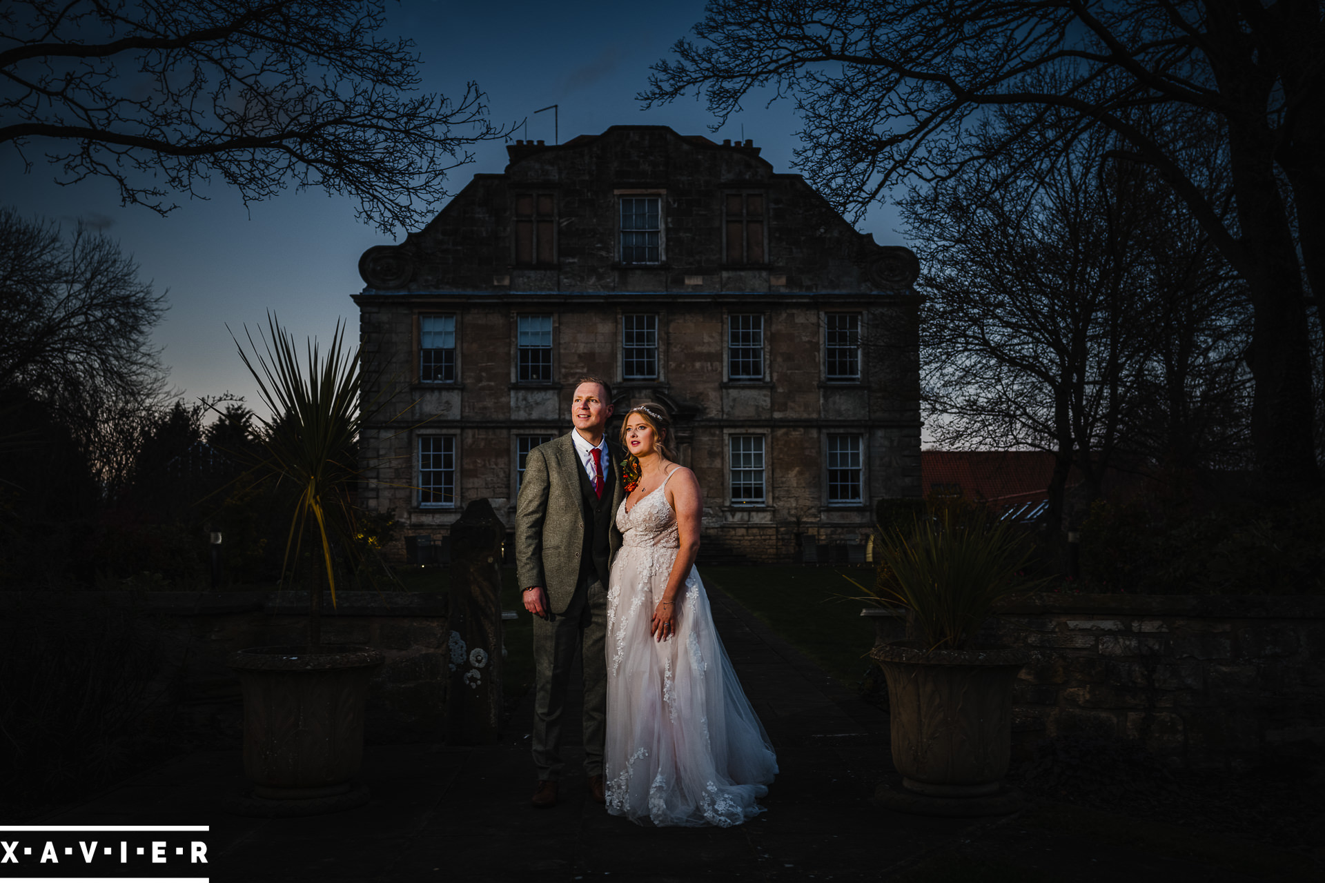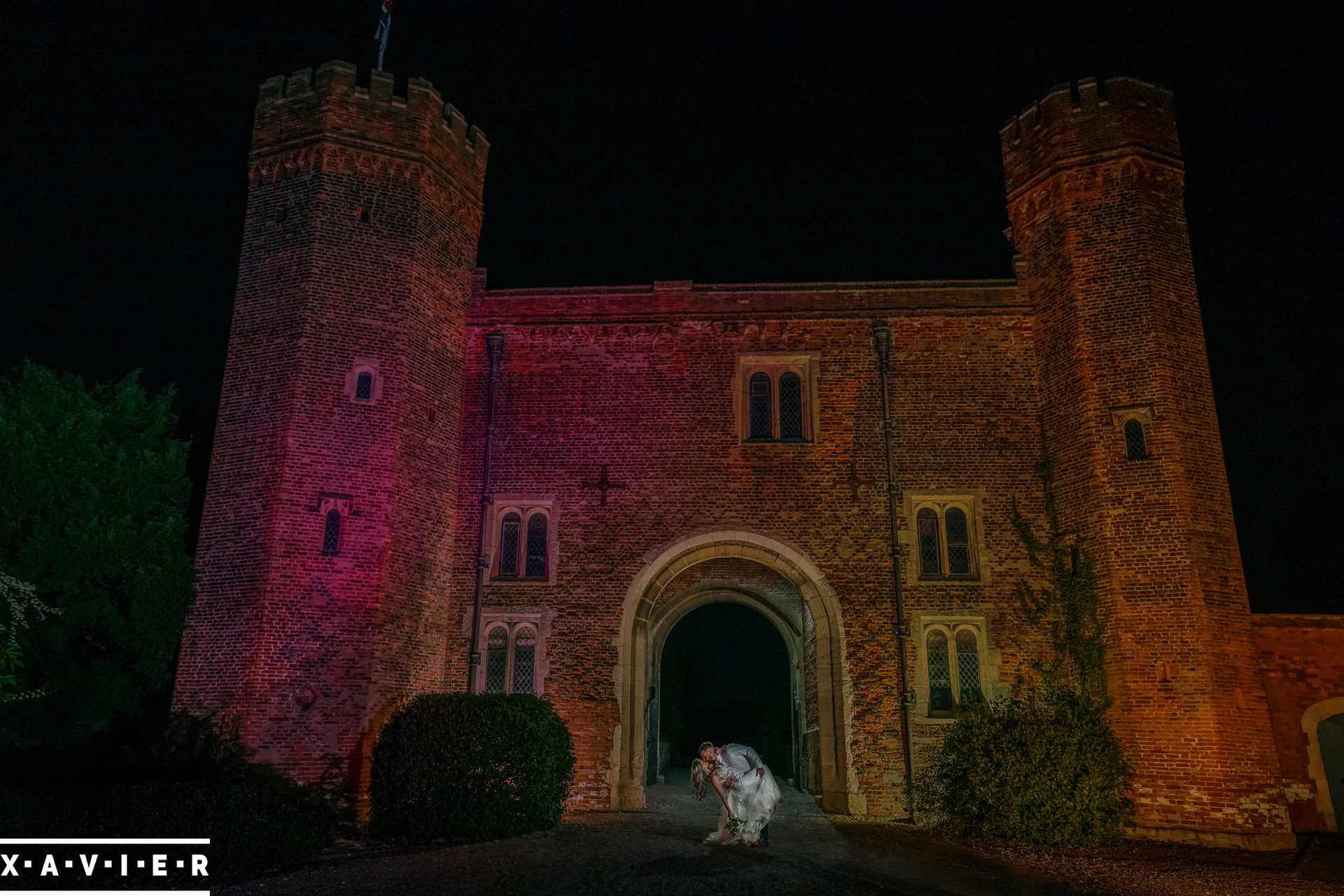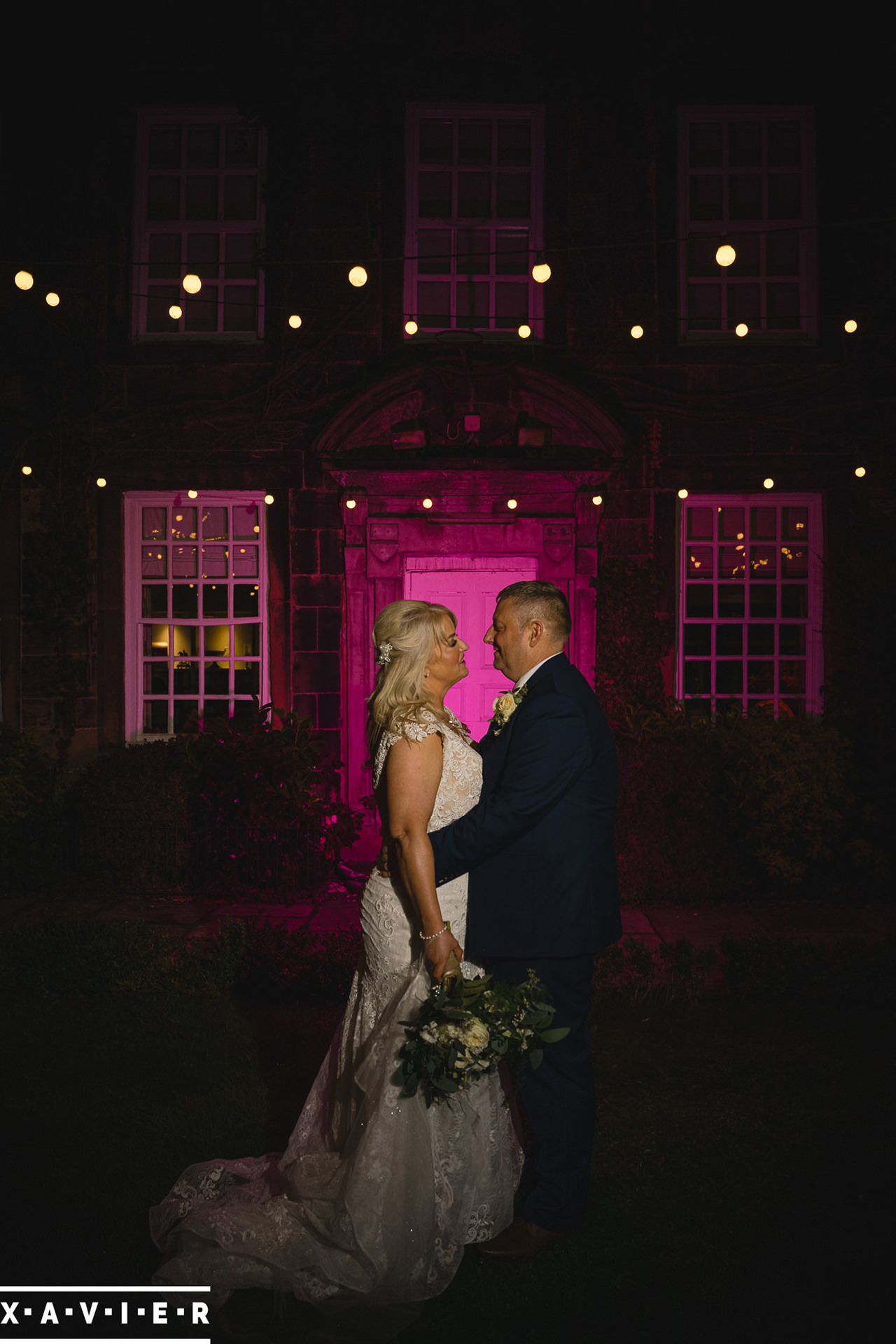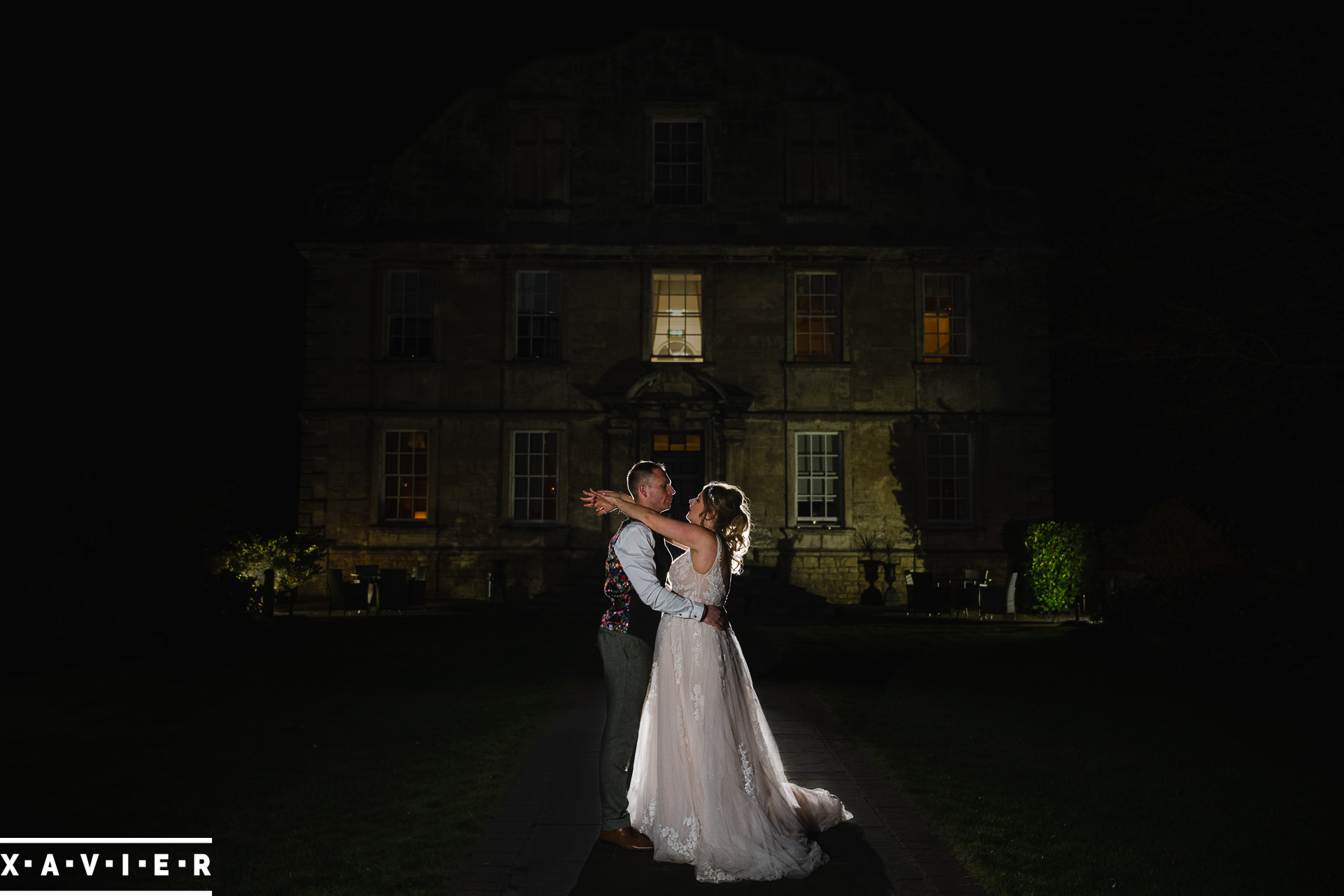 Whether your wedding day brings a stunning sunset, or a vibrant blue sky, when the light falls I'll direct you for dramatic nightime portraits